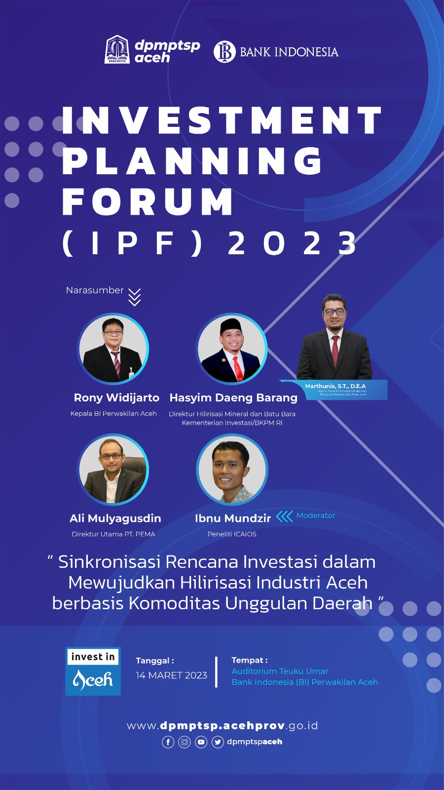 Dinas Penanaman Modal dan Pelayanan Terpadu Satu Pintu (DPMPTSP) Aceh bekerjasama dengan Bank Indonesia (BI) Perwakilan Aceh akan menyelenggarakan kegiatan “Investment Planning Forum (IPF) 2023” pada Hari Selasa Tanggal 14 Maret 2023 di Auditorium Teuku Umar Bank Indonesia (BI) Perwakilan Aceh di Banda Aceh. Investment Planning Forum 2023 mengusung tema “Sinkronisasi Rencana Investasi dalam Mewujudkan Hilirisasi Industri Aceh berbasis Komoditas Unggulan Daerah” akan melibatkan Bupati/Walikota, Satuan Kerja Perangkat Aceh/Kabupaten/Kota (SKPA/SKPK) terkait seluruh Aceh dan stakeholder terkait lainnya. Forum ini bertujuan mengajak semua pihak untuk mendorong pertumbuhan ekonomi Aceh melalui industri pengolahan dengan memberdayakan komoditas unggulan Aceh berbasis SDA, mengembangkan ekonomi berbasis kawasan dan menghasilkan kegiatan prioritas untuk pemenuhan target realisasi investasi tahun 2023-2026. Adapun narasumber yang akan hadir berasal dari Kementrian Investasi/BKPM RI, Bank Indonesia, PT. Pembangunan Aceh, Perusahaan yang bergerak dibisnis hilirisasi dan akan dimoderatori oleh peneliti ICAIOS. Selanjutnya akan dilakukan Penandatanganan Komitmen Bersama, yaitu kesepakatan usulan pengembangan hilirisasi industri berbasis komoditas daerah oleh masing-masing Bupati/Walikota se-Aceh.